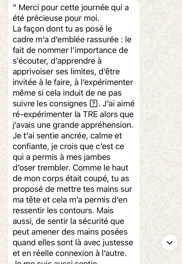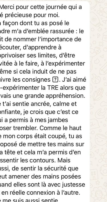 Je ne finirai pas cette formation car à l'époque, étant encore très activée, je lui préférerai une approche plus "système nerveux" orienté: le T.R.E (Tension Release Exercice).