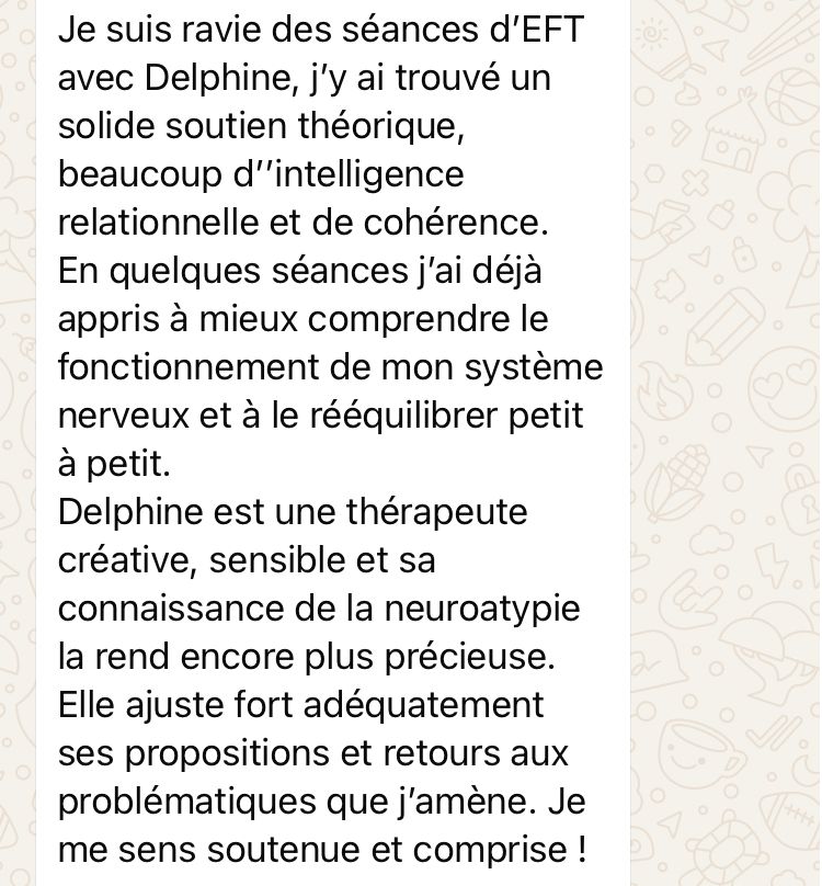 En plus du T.R.E, je me formerai en parallèle à l'E.F.T (Emotional Freedom Technique), technique plus verbale, plus proche des émotions vécues lors du trauma. Pour moi, l'E.F.T fonctionne comme l'E.M.D.R mais a une approche "plus un douceur", moins "retraumatisante", ce qui m'importe beaucoup - moi qui ai été fort retraumatisée par les différentes thérapies que j'ai faites.